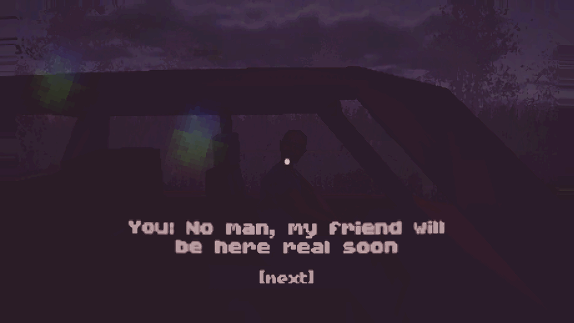 I was surprised to see that this was made as an "experiment" in 1 day. Heck, I can barely come up with a decent scene or story beats in 1 day, yet you made a fully functional game - bravo on that! Loved the creepy vibes from the guy in the "bush" and the "driver". Overall, neat, short experience!